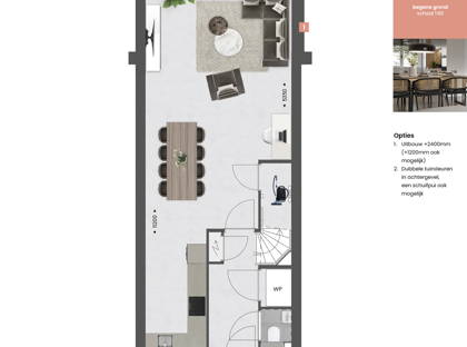 Met de beschikbare opties geef je jouw nieuwe woning eenvoudig een persoonlijke touch. Denk bijvoorbeeld aan een extra ruime woonkamer dankzij een uitbouw van 1,20 of zelfs 2,40 meter aan de achterzijde. Wil je meer verbinding tussen binnen en buiten? Kies dan voor openslaande tuindeuren of een schuifpui.