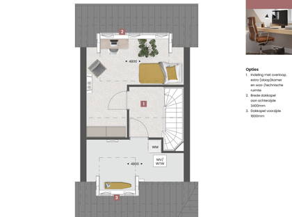 Ook op de tweede verdieping zijn er volop mogelijkheden. Met een dakkapel en/of dakramen creëer je een lichte, ruime (slaap)kamer of een fijne speelruimte. Liever een praktische indeling? Richt een aparte wasruimte in door een scheidingswand te plaatsen.