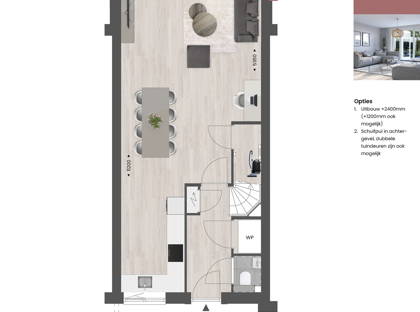 Met de beschikbare opties geef je jouw nieuwe woning eenvoudig een persoonlijke touch. Denk bijvoorbeeld aan een extra ruime woonkamer dankzij een uitbouw van 1,20 of zelfs 2,40 meter aan de achterzijde. Wil je meer verbinding tussen binnen en buiten? Kies dan voor openslaande tuindeuren of een schuifpui.