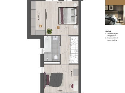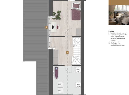 Op de eerste verdieping kun je kiezen voor een aparte toiletruimte. Of combineer de twee slaapkamers aan de achterzijde tot één ruime master bedroom. Van de tweede verdieping maak je met een combinatie van diverse indelingsopties een prachtige woonverdieping met bijvoorbeeld een extra slaapkamer voorzien van dakkapel en een royale overloop.
