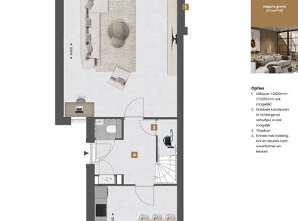 Met de beschikbare opties geef je jouw nieuwe woning eenvoudig een persoonlijke twist. Zo vergroot je de woonkamer met een uitbouw van 1,20 of zelfs 2,40 meter aan de achterzijde, of kies je voor een extra brede woonkamer. Wil je meer contact met de tuin? Kies dan voor openslaande tuindeuren of een schuifpui voor een mooie verbinding tussen binnen en buiten.