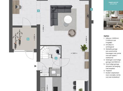Er zijn volop mogelijkheden om deze woning naar jouw wensen aan te passen. Op de begane grond kun je kiezen voor een uitbouw van 1,20 of 2,40 meter, waarmee je direct meer leefruimte creëert. Wil je liever de keuken aan de voorzijde? Ook dat is mogelijk. Daarnaast kun je de garage verlengen en/of opsplitsen in een berging en een extra ruimte die je bij de woning betrekt – ideaal voor bijvoorbeeld een werkkamer, speelruimte of hobbyruimte.