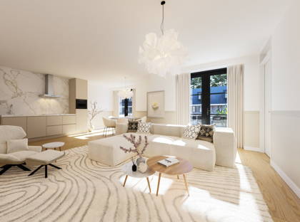 De entree geeft toegang tot de hal met het separate toilet, de meterkast en de doorloop naar de woonkamer. De living met open keuken vormt het centrale hart van de appartementen; een lichte en overzichtelijke ruimte die uitnodigt tot het creëren van een prettige zit- en eethoek. De keuken biedt volop mogelijkheden voor een moderne, efficiënte indeling.