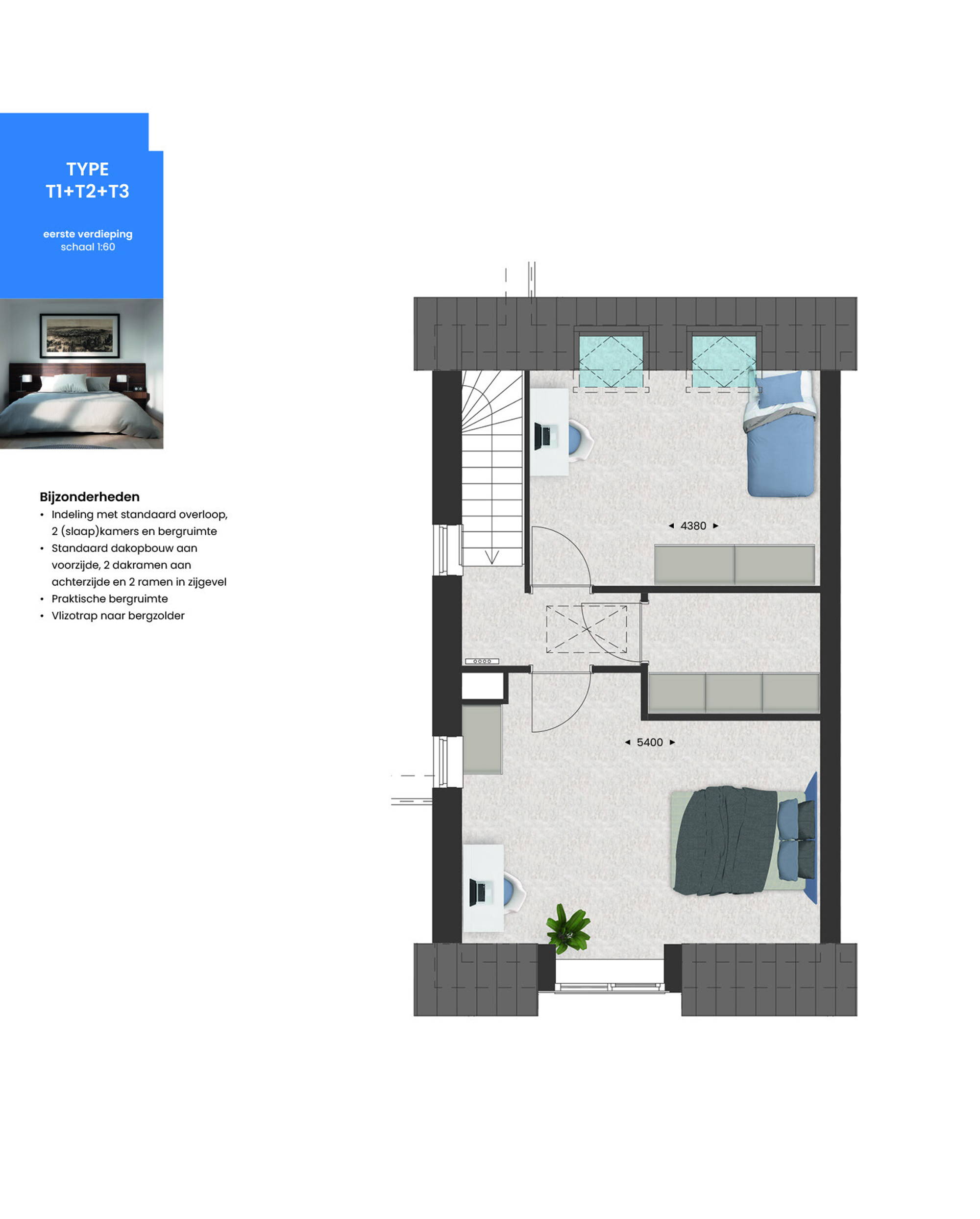 Verdieping met gemetselde dakopbouw aan voorzijde en dakraam aan achterzijde