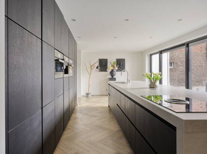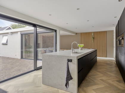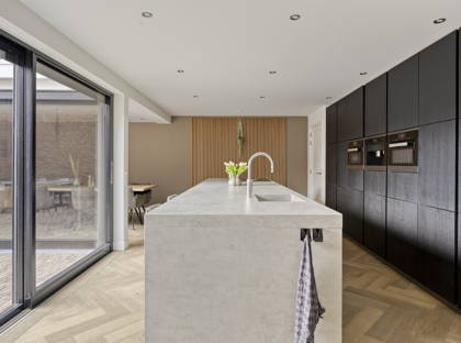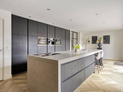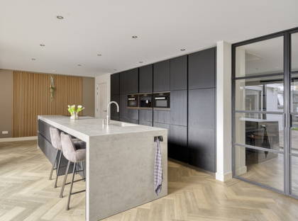 + De moderne woonkeuken is uitgerust met luxe inbouwapparatuur van Miele, waaronder een combi-oven, ingebouwd koffiezetapparaat, stoomoven, koelkast, vriezer en vaatwasser. Het kookeiland is verder voorzien van een Bora inductiekookplaat met geïntegreerde afzuiging en een bar om aan te zitten. Het keramische werkblad en de Quooker maken het geheel compleet.