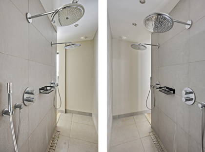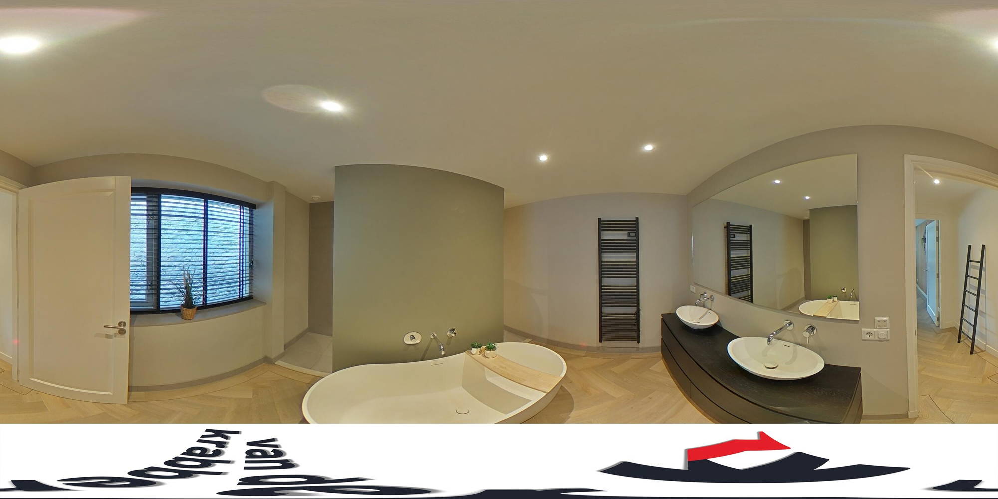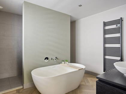 + Op de begane grond bevindt zich ook de stijlvolle badkamer, voorzien van dubbele regendouche, vrijstaand ligbad, badkamermeubel met dubbele wastafel en inbouwkranen, en designradiator. De separate toiletruimte is voorzien van een wandtoilet en fonteintje.