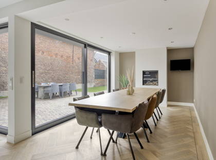 + De ruime eetkamer heeft een eigen gashaard, spotverlichting en twee grote schuifpuien met directe toegang tot de tuin.