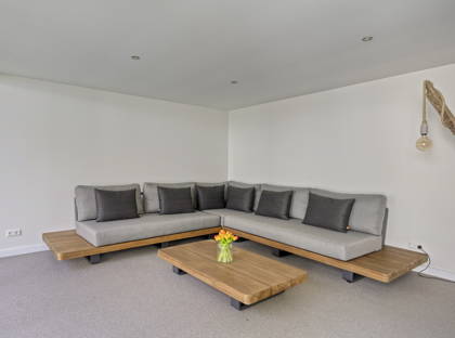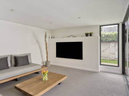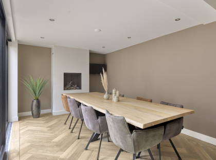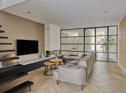 + De woonkamer is sfeervol ingericht met een gashaard, een op maat gemaakte tv-kast met keramisch blad, stalen deuren en strak stucwerk met spotverlichting. Dankzij de vloerverwarming ervaar je hier op en top comfort.