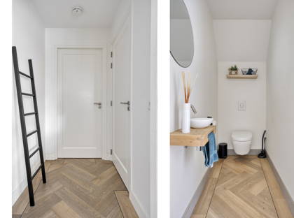 + De entree straalt direct kwaliteit uit, met praktische inbouwkasten, een pvc visgraatvloer en een moderne meterkast met glasvezel.