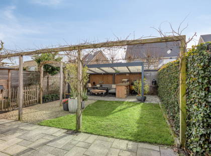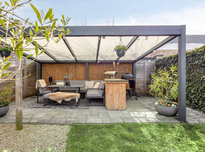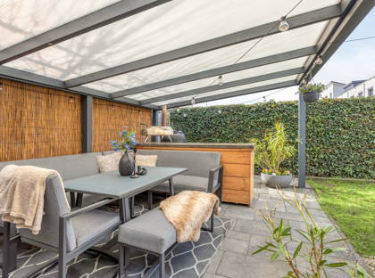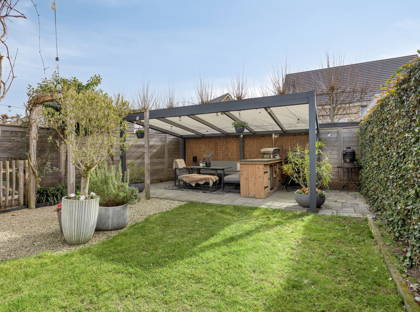 Beneden in de achtertuin is er voldoende ruimte om vrienden en familie te ontvangen of om te spelen. Onder de overkapping kun je altijd droog en comfortabel zitten en dankzij het elektrisch bedienbare zonnescherm, dat vanuit de woonkamer te bedienen is, heb je altijd een prettig plekje in de schaduw.
