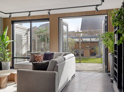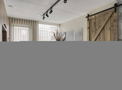 Aangrenzend aan de open keuken vind je het eetgedeelte en de ruime woonkamer. Via een houten schuifdeur loop je hier de extra kamer in, die dankzij de (opberg)ruimte ideaal is als speelkamer, hobbyruimte of kantoor. De ruimte is afzonderlijk in temperatuur te regelen, waardoor je hier altijd comfortabel kunt spelen of werken. Door de schuifdeur kun je je ongestoord terugtrekken, maar ook eenvoudig de verbinding met de rest van de woning opzoeken wanneer je dat wilt.