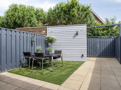De onderhoudsvriendelijke achtertuin is gesitueerd op het noorden en beschikt over een fraaie overkapping, sierbestrating, kunstgras en een achterom. Achterin de tuin staat een praktische houten berging met ruimte voor fietsen en opslag.