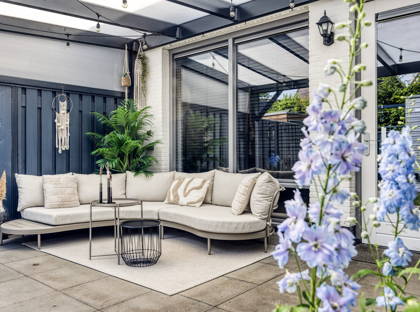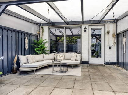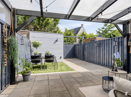 + Zonnige tuin met overkapping en achterom