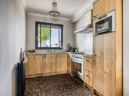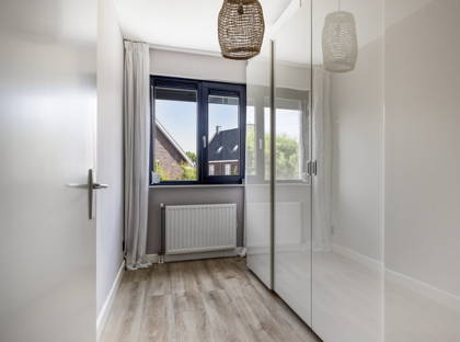 Je komt binnen via de hal met meterkast en een toiletruimte. De lichte woonkamer is afgewerkt met een mooie pvc-vloer, strakke wanden en plafonds, en heeft een airco voor extra verkoeling of bijverwarming. Aan de voorzijde ligt de open keuken, compleet met vaatwasser, kookplaat en koelkast. De grote raampartijen zorgen voor een prettige lichtinval en maken de woning heerlijk ruimtelijk.