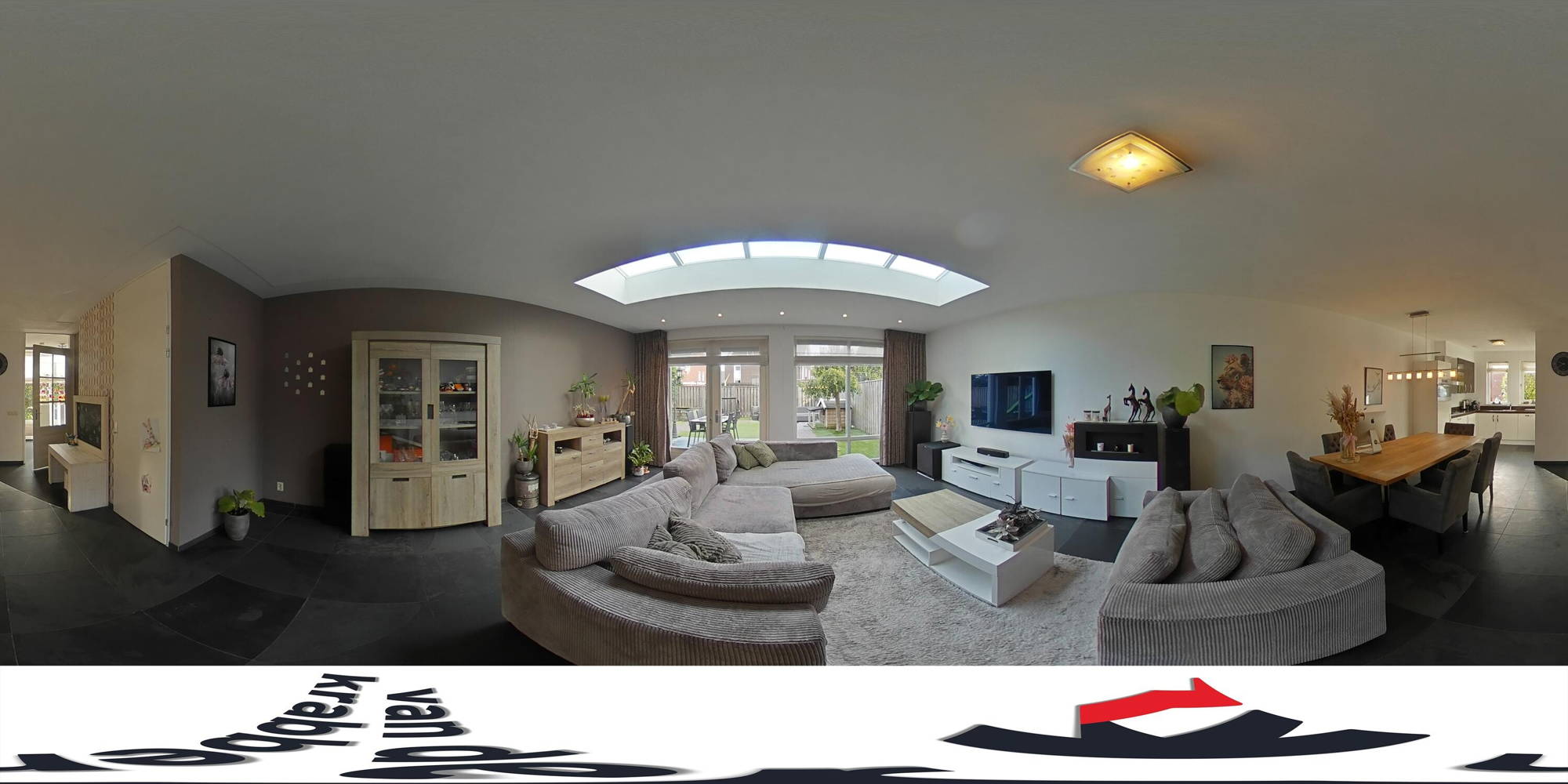 + De uitgebouwde woonkamer met lichtstraat en openslaande deuren naar de achtertuin heeft een mooie lichtinval.