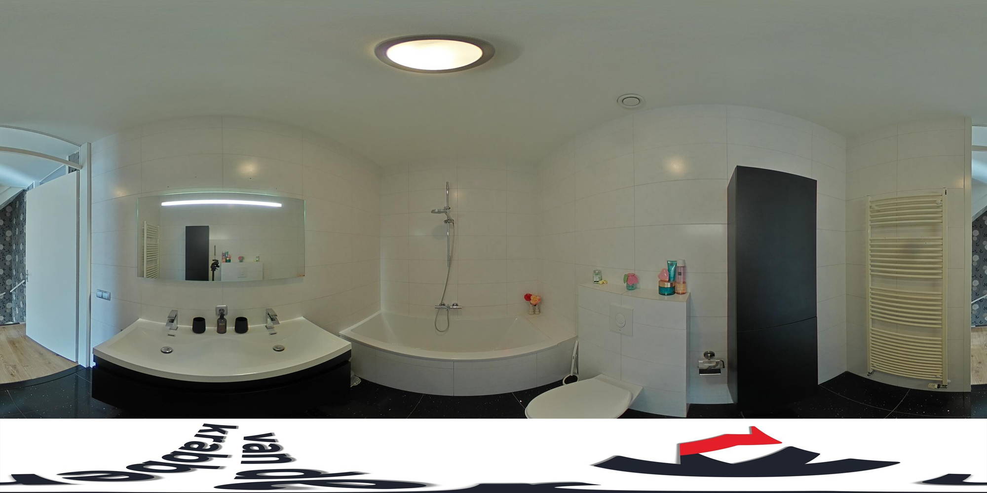 + De badkamer is luxe uitgevoerd met een ligbad, wandtoilet, badkamermeubel met dubbele wastafel en designradiator.