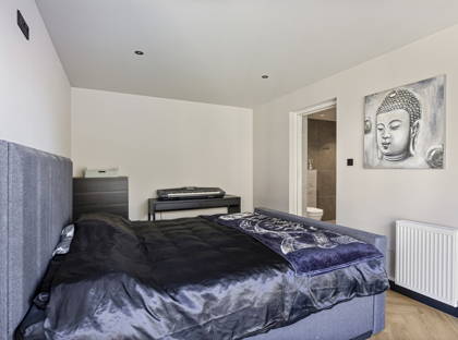 Deze luxe keuken is van alle gemakken voorzien en beschikt over een stijlvol kook- en spoeleiland, hoogwaardige inbouwapparatuur en een praktische bijkeuken met witgoedaansluitingen. Daarnaast is er een doorgang naar de aanbouw, waar zich een extra slaapkamer met een moderne, en-suite badkamer bevindt. Dit maakt de woning ideaal voor gelijkvloers wonen of als comfortabele gastenkamer.