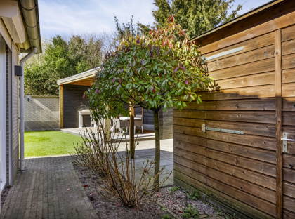 De ruime achtertuin is een heerlijke plek om te ontspannen. Dankzij de vrije ligging aan de achterzijde geniet je hier volop van privacy. De tuin is voorzien van een overkapping, ideaal voor lange avonden buiten. Daarnaast beschikt de woning over een oprit voor meerdere auto’s.