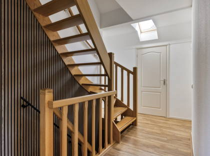 Bij binnenkomst in de ruime hal valt direct de lichtinval en ruimtelijkheid van de woning op. Hier bevinden zich de meterkast, garderobe, toiletruimte en de trapopgang naar de eerste verdieping.