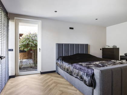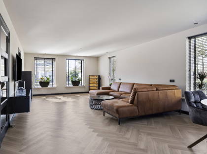 De royale woonkamer is een heerlijke plek om te ontspannen. Dankzij de open indeling en grote raampartijen profiteer je hier van een fijne lichtinval en een ruimtelijk gevoel. De woonkamer loopt naadloos over in de woonkeuken, die absoluut een eyecatcher is.