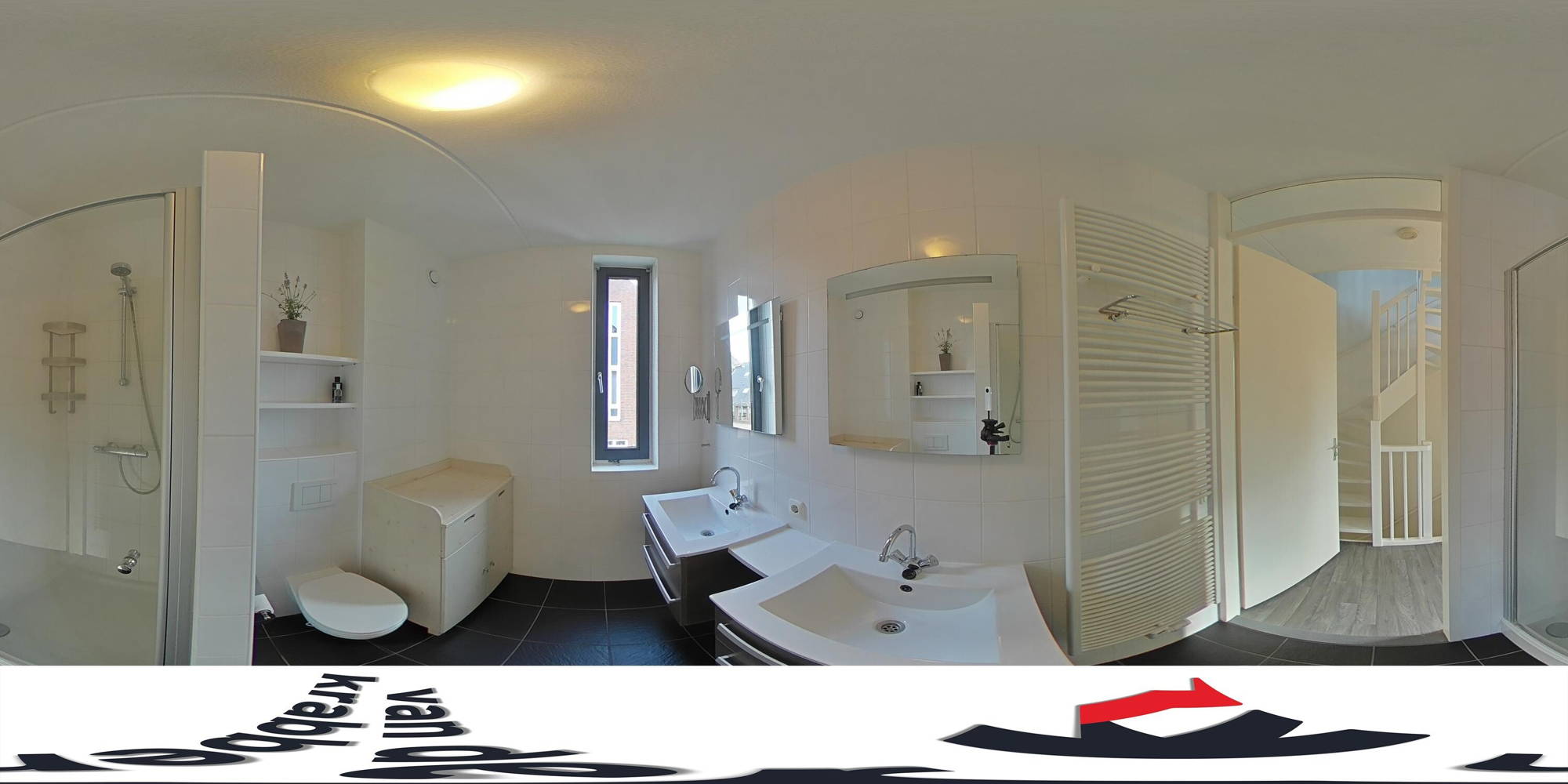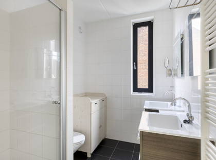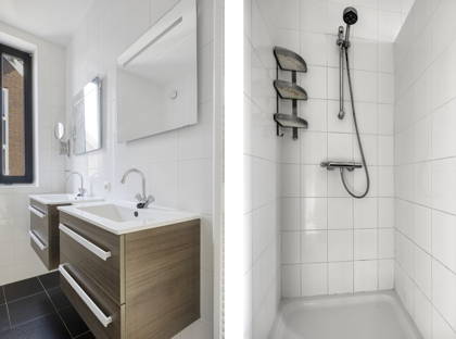 + Badkamer met douche, dubbele wastafelmeubel en toilet