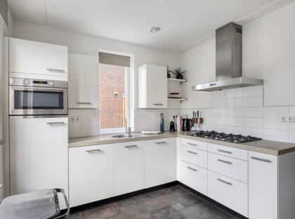 Aan de voorzijde van de woning bevindt zich de woonkeuken, uitgerust met diverse inbouwapparatuur, waaronder een koelkast (vernieuwd 2025), combi-oven en vaatwasser (vernieuwd in 2024) en een 5-pits gaskookplaat (4 pitten en een wokpit). De inpandige garage is momenteel ingericht als kantoorruimte en voorzien van een tegelvloer en een keukenblok met warm- en koud water. Daarnaast is de ruimte geïsoleerd en uitgerust met een radiator, waardoor deze uitstekend geschikt is voor werken aan huis of een praktijkruimte.