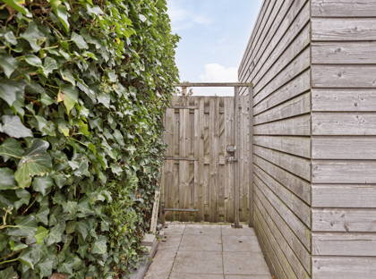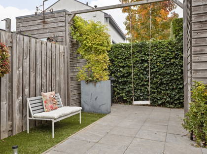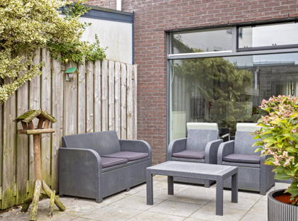 + De achtertuin is verzorgd aangelegd met twee terrassen, kunstgras, een houten berging en een directe achterom.
