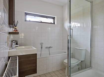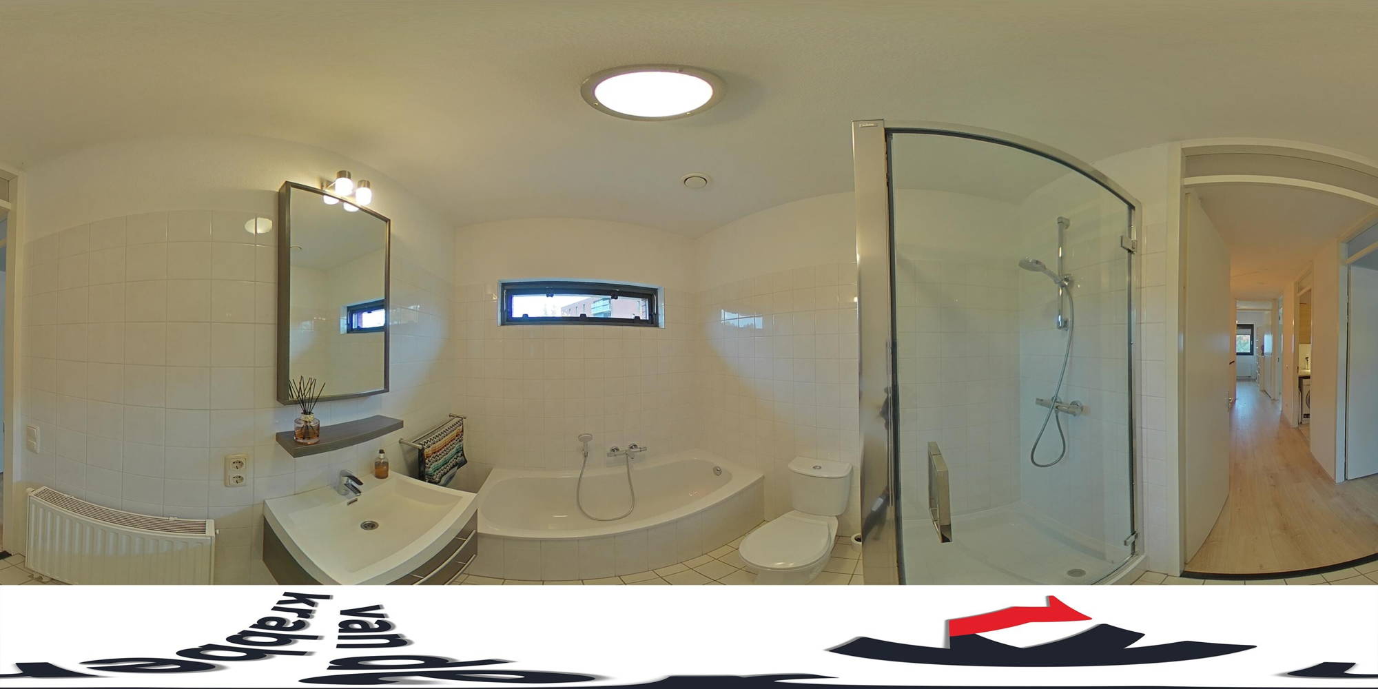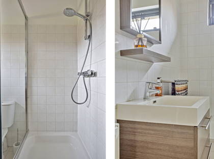 + De badkamer is compleet ingericht met een ligbad, douche, toilet en badkamermeubel met wastafel.