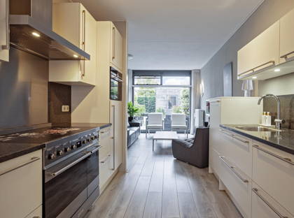 + De open leefkeuken (2015) is luxe uitgevoerd met een inductiekookplaat, afzuigkap, dubbele oven van Smeg, stoomoven, vaatwasser op hoogte, koelkast en spotverlichting. Vanuit de eethoek heb je een vrij uitzicht op de groene woonomgeving.