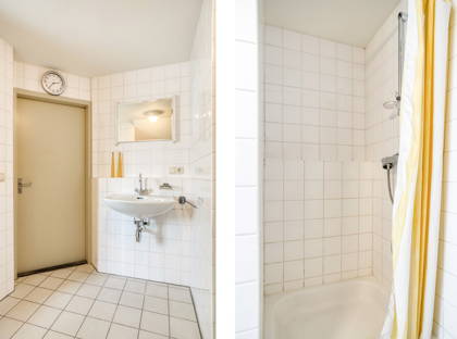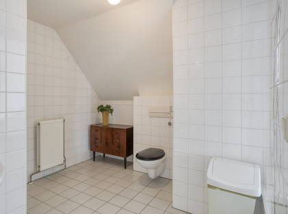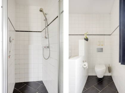 + De volledig betegelde badkamer op de verdieping is uitgerust met een douche, wastafel en wandtoilet.
