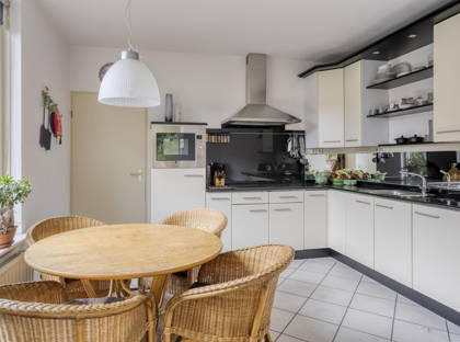 + De halfopen woonkeuken is voorzien van een inductiekookplaat, afzuigkap, koelkast, combimagnetron en vaatwasser.