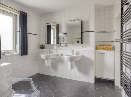 + Op de begane grond is een royale slaapkamer aanwezig met inbouwkast, markiezen aan de buitenzijde en directe toegang tot de moderne badkamer met inloopdouche, wandtoilet, dubbele wastafel, designradiator en vloerverwarming.