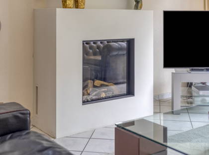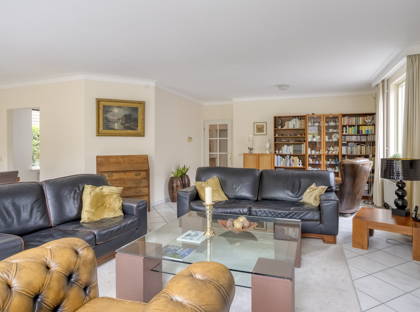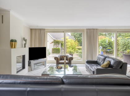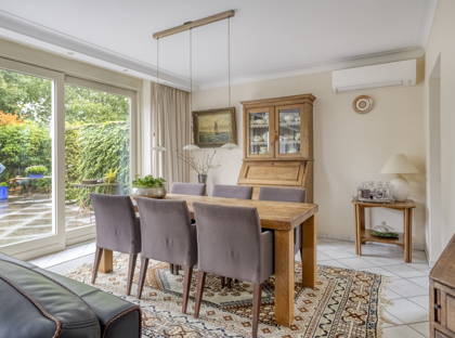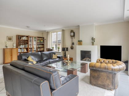+ De lichte L-vormige woonkamer is erg ruim, biedt plaats voor een royale eethoek en is voorzien van een sfeervolle gashaard, twee schuifpuien naar de tuin en airconditioning.