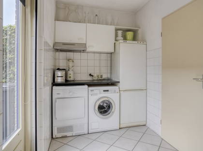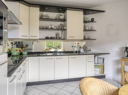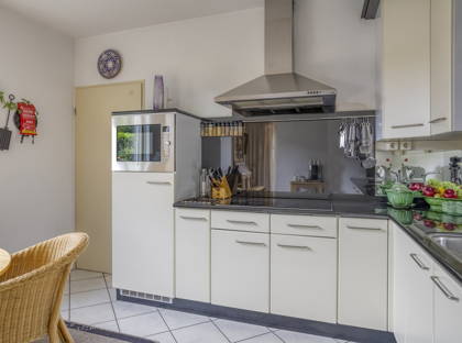 + Aangrenzend bevindt zich de praktische bijkeuken met extra werkblad, twee voorraadkasten en de witgoedaansluitingen.