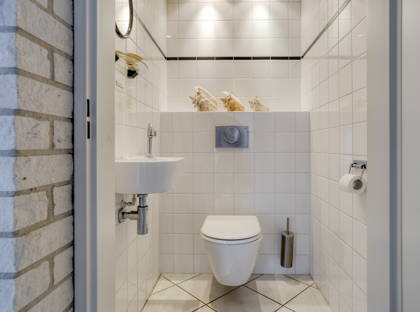 + Via de overkapte voordeur stap je binnen in de ruime entree met de meterkast (9 groepen en 2 aardlekschakelaars), een garderobenis, een moderne toiletruimte met wandtoilet en fonteintje en toegang tot de verschillende ruimtes.