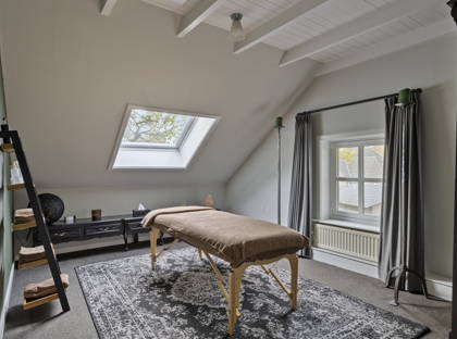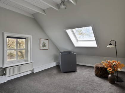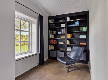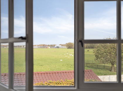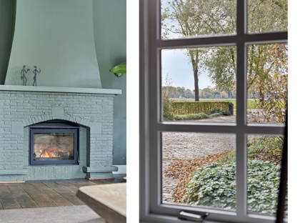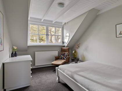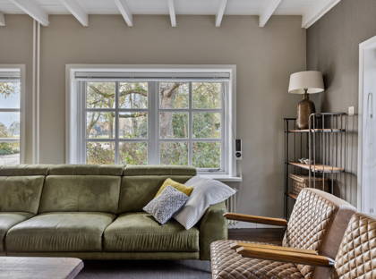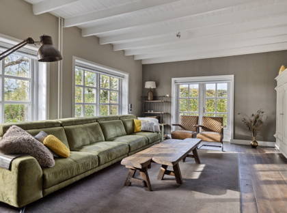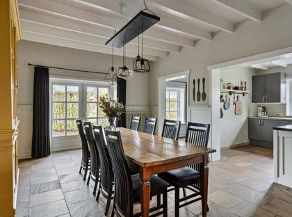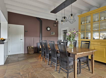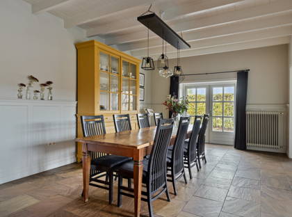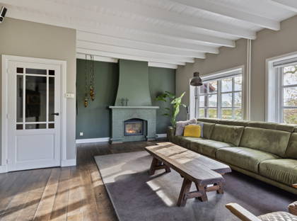 Dankzij de houten vloer, de originele schouw met houthaard en het houten balkenplafond is de woonkamer een heerlijk knusse en warme ruimte. Door de grote raampartijen komt er veel licht binnen. Dit is een fantastische plek om met het hele gezin of met vrienden te relaxen.
