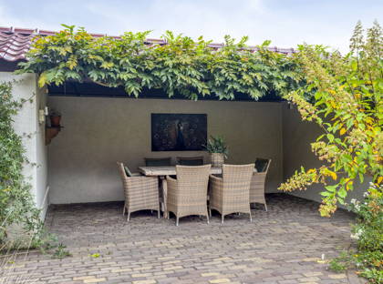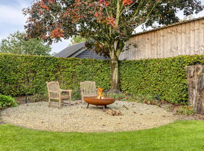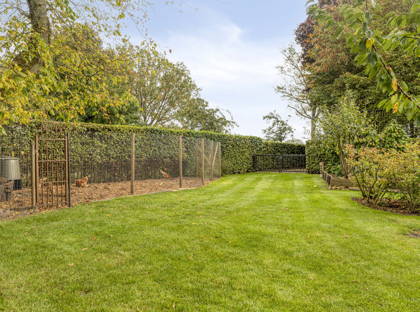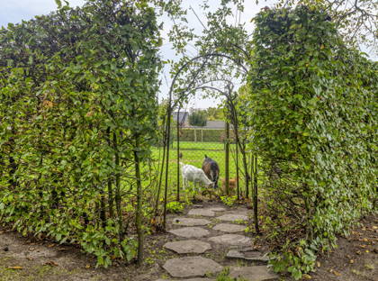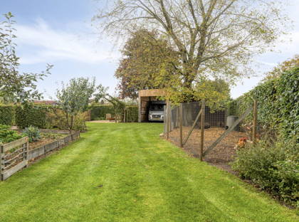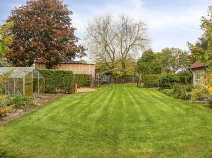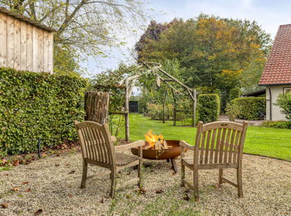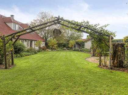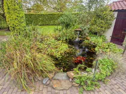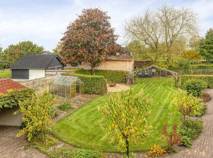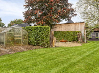 Tot slot komen we bij de buitenruimte van deze woonboerderij. De tuin omringt de woning en biedt met 2.250 m2 alle ruimte om jouw tuinwensen in vervulling te laten gaan. Het perceel is speels ingericht met graspartijen, volwassen bomen, borders, een vijver, een moestuin, een kas en veel verschillende terrassen en hoekjes om zitplekken te creëren. Luieren, spelen, tuinieren: in deze tuin kan het allemaal!