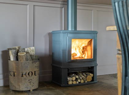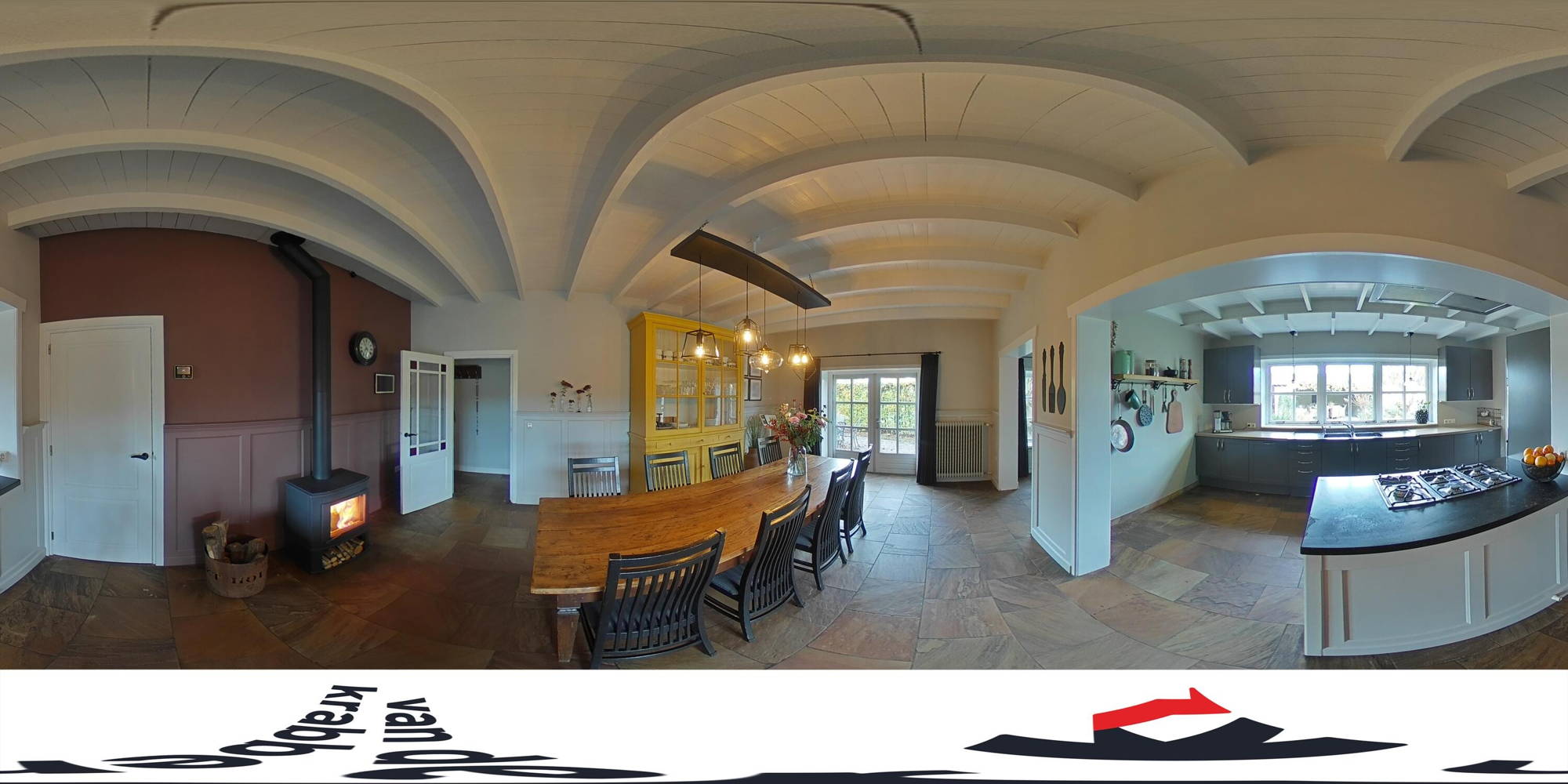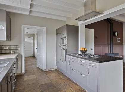 De andere deur in de hal leidt naar de woonkeuken. Het hart van het huis en een heerlijke ruimte om te tafelen, borrelen, spelletjes te spelen of gewoon de dag door te brengen. De keuken wordt verwarmd door zowel een sfeervolle houtkachel als door vloerverwarming, die samen zorgen voor een aangename en gelijkmatige warmte.