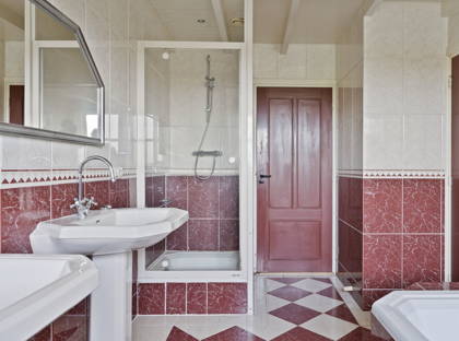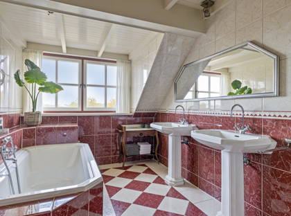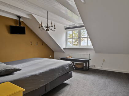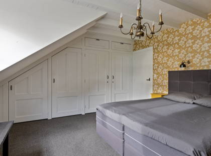 Op de eerste verdieping zijn maar liefst vijf slaapkamers. Alle kamers zijn ruim, licht, mooi afgewerkt en sfeervol dankzij de houten balken. De grootste slaapkamer heeft grote – en handige! – inbouwkasten. Op de eerste verdieping is ook een toilet en een ruime badkamer die groot genoeg is voor het hele gezin. De badkamer is uitgerust met een ligbad, een douche en een dubbele wastafel.