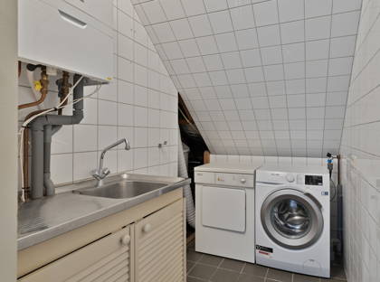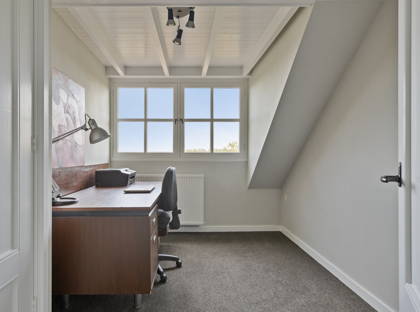 De open keuken is voorzien van veel kast- en aanrechtruimte, wat het een genot maakt om in te werken. Met een groot gasfornuis, afzuigkap, magnetron, oven, Quooker, vaatwasser en koelkast, is deze keuken voorzien van alle apparatuur die je nodig hebt. Naast de keuken is nog een knusse kamer, die perfect ingericht kan worden als werk- of speelkamer.