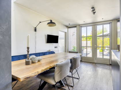 In de woonkamer is ruimte om met een grote bank een gezellige zithoek te creëren. Ook kun je hier een grote kast kwijt, of bijvoorbeeld een speelhoek maken. Via de dubbele doorgang kom je uit in de ruime leefkeuken. Deze is dankzij de grote raampartij aan de achterzijde en de lichtstraat in het dak bijzonder licht. De keuken met stoere uitstraling is voorzien van een grote oven, koelkast, vaatwasser en een inductiekookplaat met ingebouwde afzuiging. Vanuit de keuken heb je ook toegang tot twee praktische extra ruimtes: de bijkeuken en de berging.
