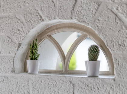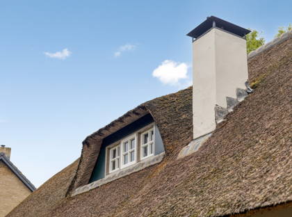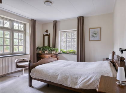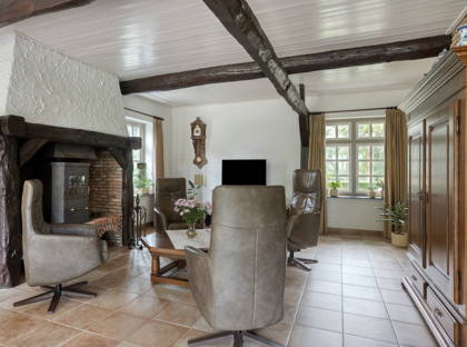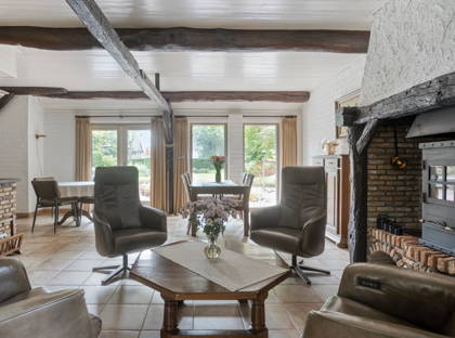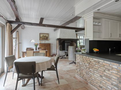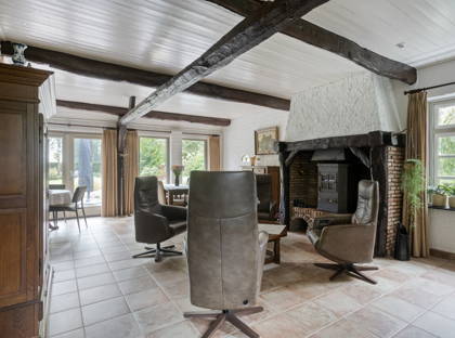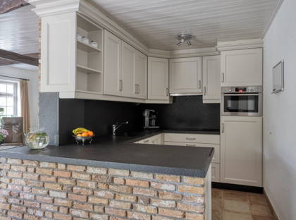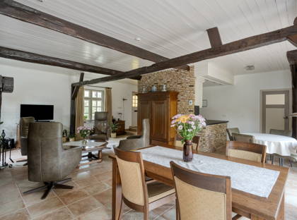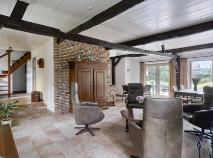 De woonkamer heeft een rustieke, lichte uitstraling. Dankzij ramen aan drie zijden geniet je hier van veel daglicht en uitkijk in de tuin. Het zichtbare gebinte in het plafond herinnert aan het oorspronkelijke karakter van de boerderij. Het halfopen kookgedeelte, voorzien van moderne apparatuur, sluit hier vervolgens perfect op aan.