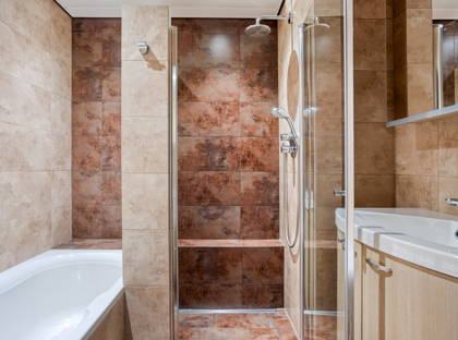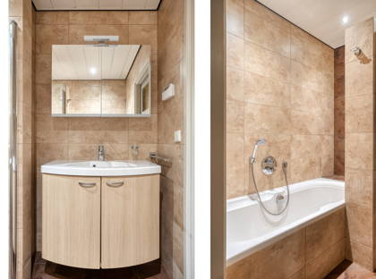 + Complete badkamer is geheel betegeld en uitgevoerd met spotverlichting, een ligbad, inloopdouche met hand- en regendouche en badkamermeubel. De aparte toiletruimte is geheel betegeld en bevat een hoog geplaatst klapraam, wandtoilet en fonteintje.