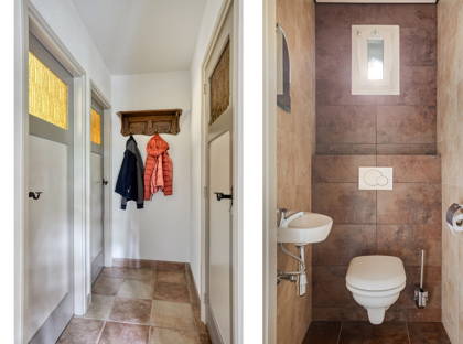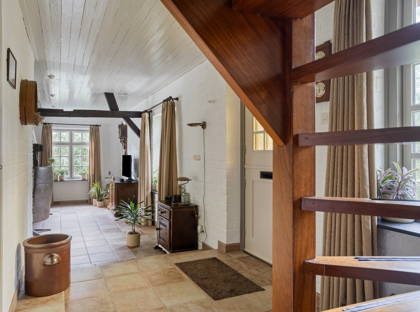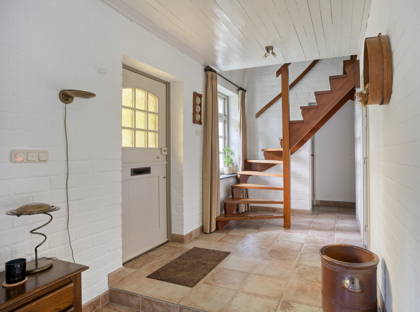 Als je vervolgens de woonboerderij binnengaat, maakt de hal meteen indruk. De mooie en representatieve afwerking is meteen overduidelijk. Maar ook de ruimtelijke opzet valt op, want er is een open verbinding met de woonkamer. Ook de tegelvloer loopt door in de woonkamer, keuken, bijkeuken en gang, waardoor het geheel eenheid en rust uitstraalt.
