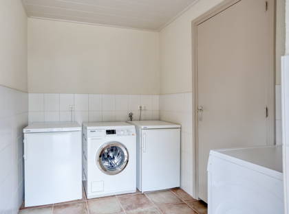 + In de bijkeuken is plaats voor de wasmachine, droger en ander witgoed. Buitendeur komt uit in de achtertuin. In de aansluitende berging is de HR-combiketel geïnstalleerd.
