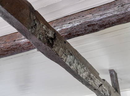+ De woonkamer heeft een rustieke, lichte uitstraling en vensters aan drie zijden. De lichte tinten van het plafond, wanden en tegelvloer versterken dit karakter. Heel fraai zichtbaar zijn de delen van het gebint in het plafond.