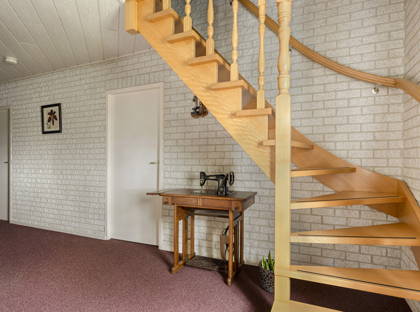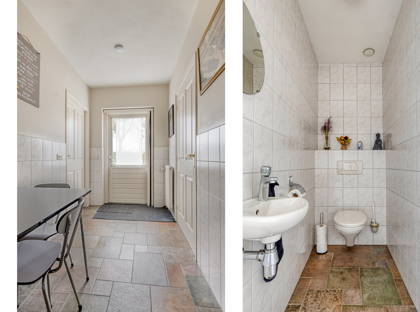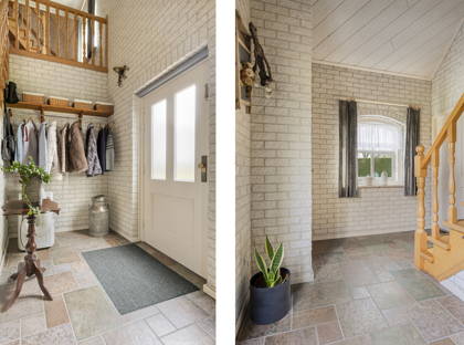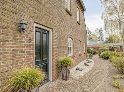 Het aanzicht van deze woonboerderij, met de uitstekend verzorgde tuin rondom het huis, is absoluut charmant te noemen. Op de lange oprit met extra parkeerplaatsen is plek voor meerdere voertuigen. De hal waarin je binnenkomt is karakteristiek dankzij de bakstenen muren en hardhouten trap.