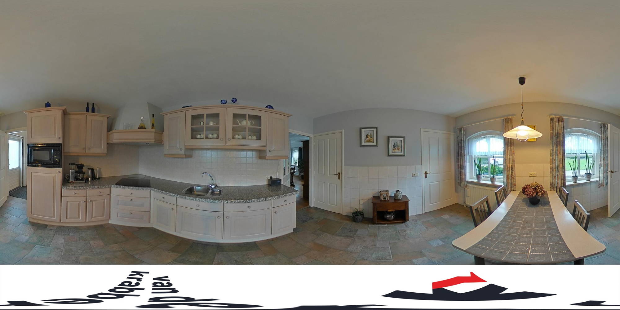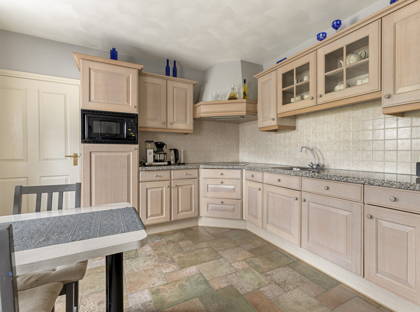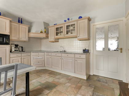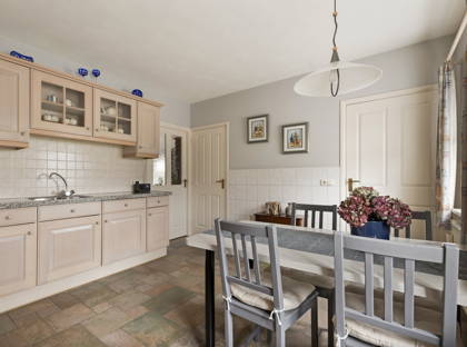 Vervolgens loop je door naar de gezellige en royale woonkeuken, het hart van het huis! De keuken is uitgerust met een keramische kookplaat, afzuigkap, combimagnetron, koelkast en vaatwasser. Dankzij de vele kasten en lades kun je al je keukenspullen, servies en voorraad kwijt. Ook is er in de keuken ruimte voor een grote eettafel, waar je met het hele gezin aan kunt zitten.