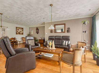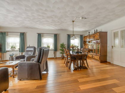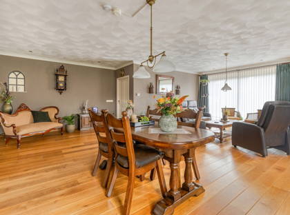 De L-vormige woonkamer met warme houten vloer is bijzonder ruim en biedt daardoor veel mogelijkheden. Een knusse zithoek, grote eettafel, speelhoek, werkruimte: het kan allemaal! Door meerdere ramen aan twee zijden stroomt er veel natuurlijk licht binnen. De woonkamer en de keuken zijn ook voorzien van vloerverwarming, voor extra comfort in koude dagen.