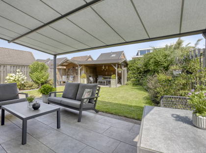 + De achtertuin is groen en verzorgd aangelegd, beschikt over twee overkappingen, een directe achterom en veel privacy. De houten berging zorgt daarnaast voor extra opslagruimte. Bovendien is de tuin voorzien van een grondwaterpomp met sproei-installatie, wat het bewateren van het groen eenvoudig en efficiënt maakt.